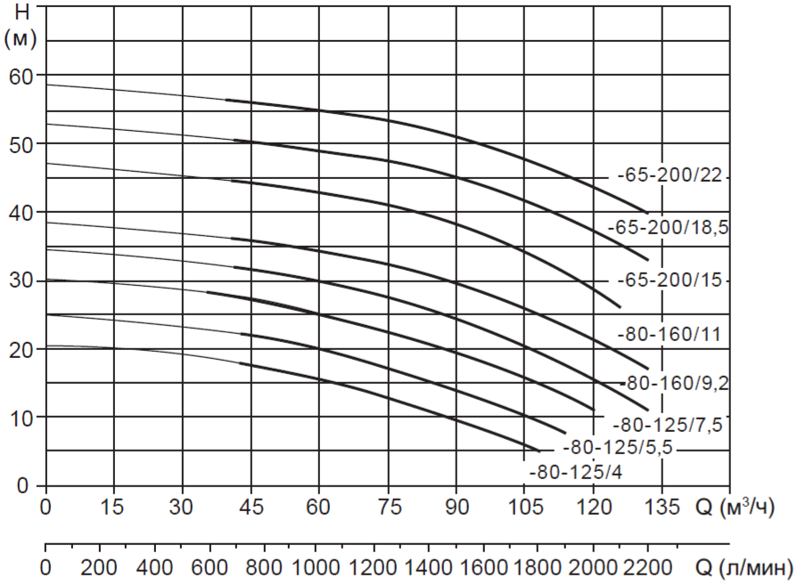 • Насосы должны использоваться в пределах рабочего интервала, указанного выделенной кривой на графике, чтобы исключить повышенный износ при высоких напорах и перегрев двигателя при больших подачах.