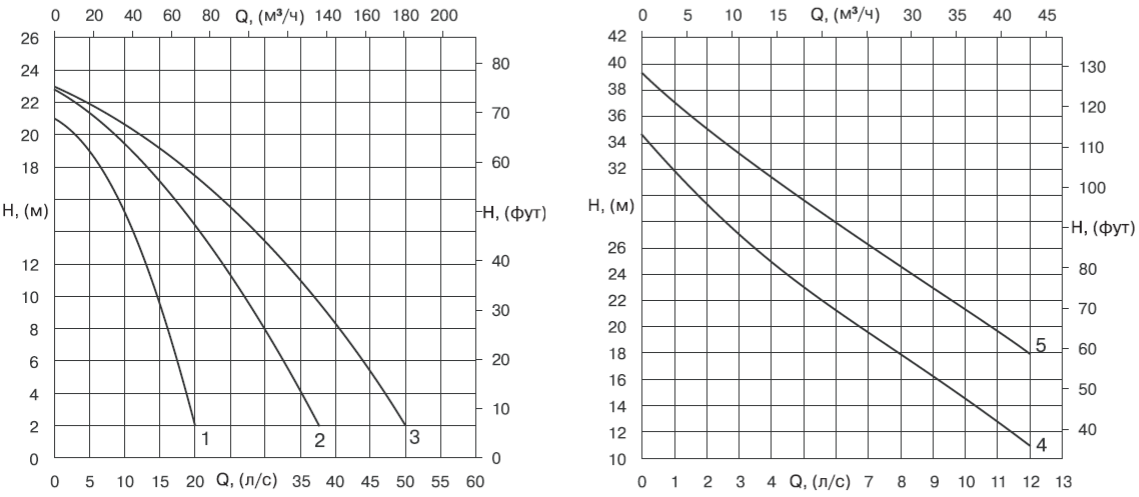 • Насосы должны использоваться в пределах рабочего интервала, указанного выделенной кривой на графике, чтобы исключить повышенный износ при высоких напорах и перегрев двигателя при больших подачах.