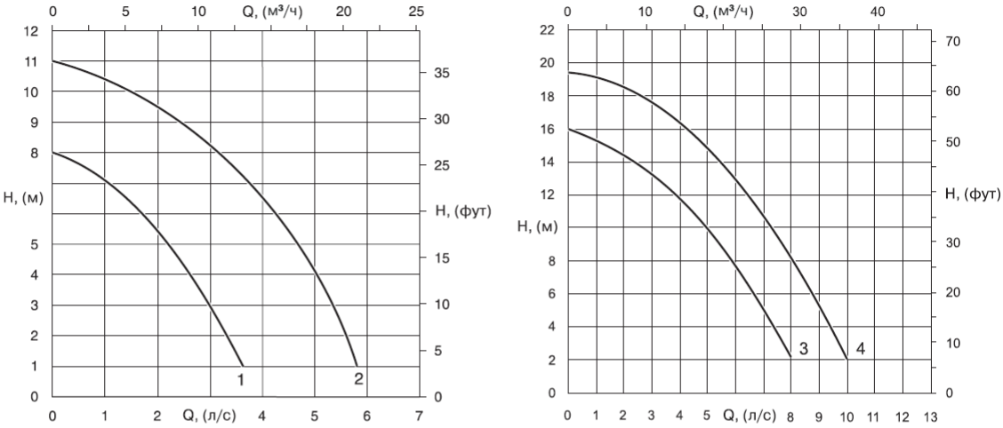 • Насосы должны использоваться в пределах рабочего интервала, указанного выделенной кривой на графике, чтобы исключить повышенный износ при высоких напорах и перегрев двигателя при больших подачах.