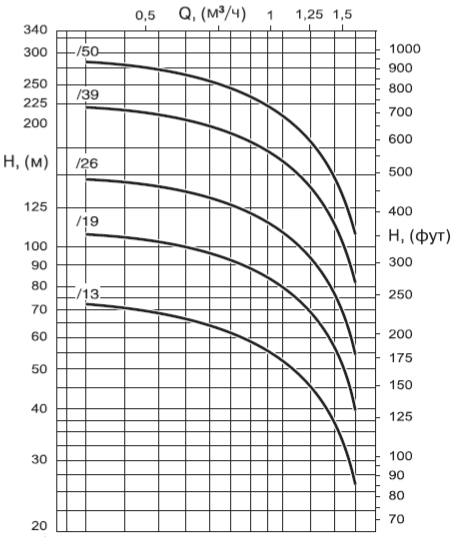 • Насосы должны использоваться в пределах рабочего интервала, указанного выделенной кривой на графике, чтобы исключить повышенный износ при высоких напорах и перегрев двигателя при больших подачах.