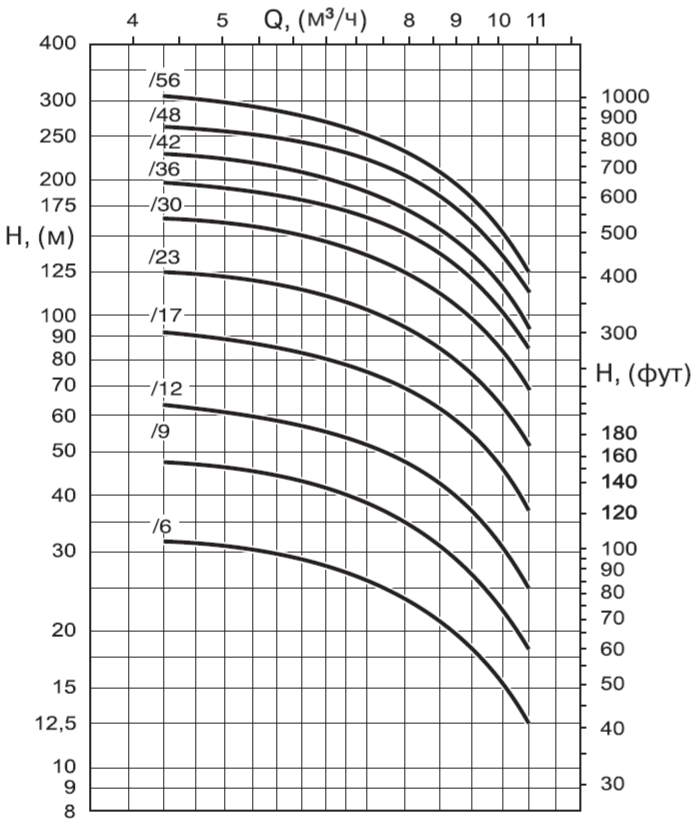 • Насосы должны использоваться в пределах рабочего интервала, указанного выделенной кривой на графике, чтобы исключить повышенный износ при высоких напорах и перегрев двигателя при больших подачах.