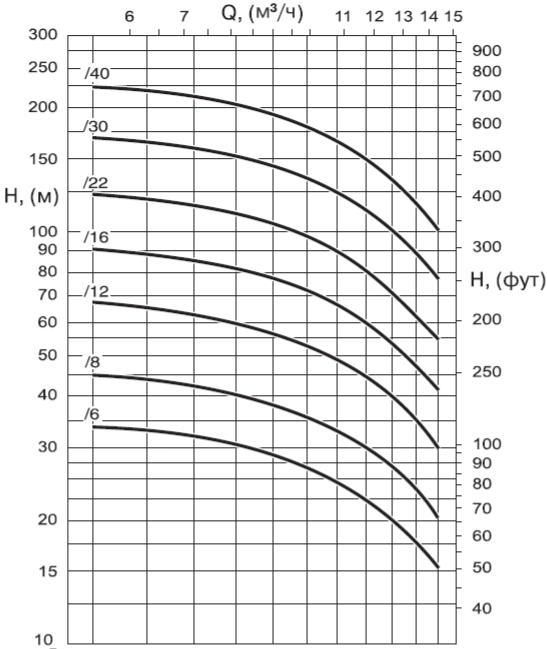 • Насосы должны использоваться в пределах рабочего интервала, указанного выделенной кривой на графике, чтобы исключить повышенный износ при высоких напорах и перегрев двигателя при больших подачах.