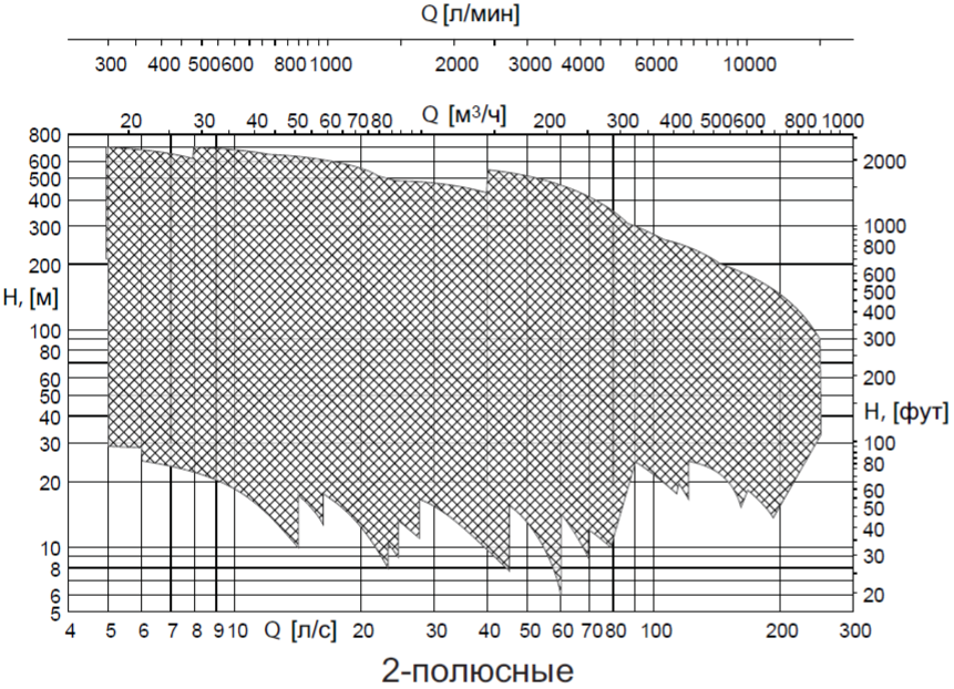 • Насосы должны использоваться в пределах рабочего интервала, указанного выделенной кривой на графике, чтобы исключить повышенный износ при высоких напорах и перегрев двигателя при больших подачах.