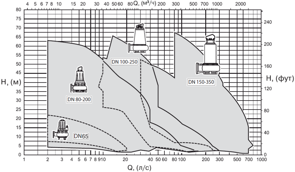 • Насосы должны использоваться в пределах рабочего интервала, указанного выделенной кривой на графике, чтобы исключить повышенный износ при высоких напорах и перегрев двигателя при больших подачах.