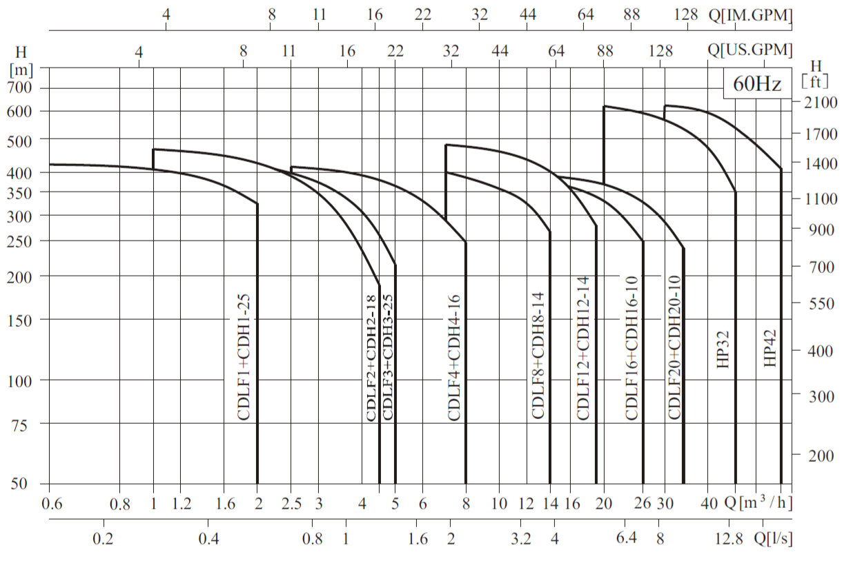 • Графики приведены для постоянной частоты вращения двигателя 50Гц: 2900-2950 об/мин, 60Гц: 3500-3540 об/мин, при испытаниях на воде с температурой 20 °С, кинематической вязкостью 1мм~/с, (1 сСт), при отсутствии в воде пузырьков воздуха.
