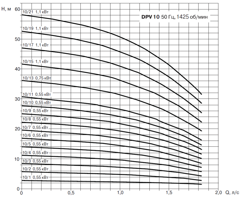 • Насосы должны использоваться в пределах рабочего интервала, указанного выделенной кривой на графике, чтобы исключить повышенный износ при высоких напорах и перегрев двигателя при больших подачах.
