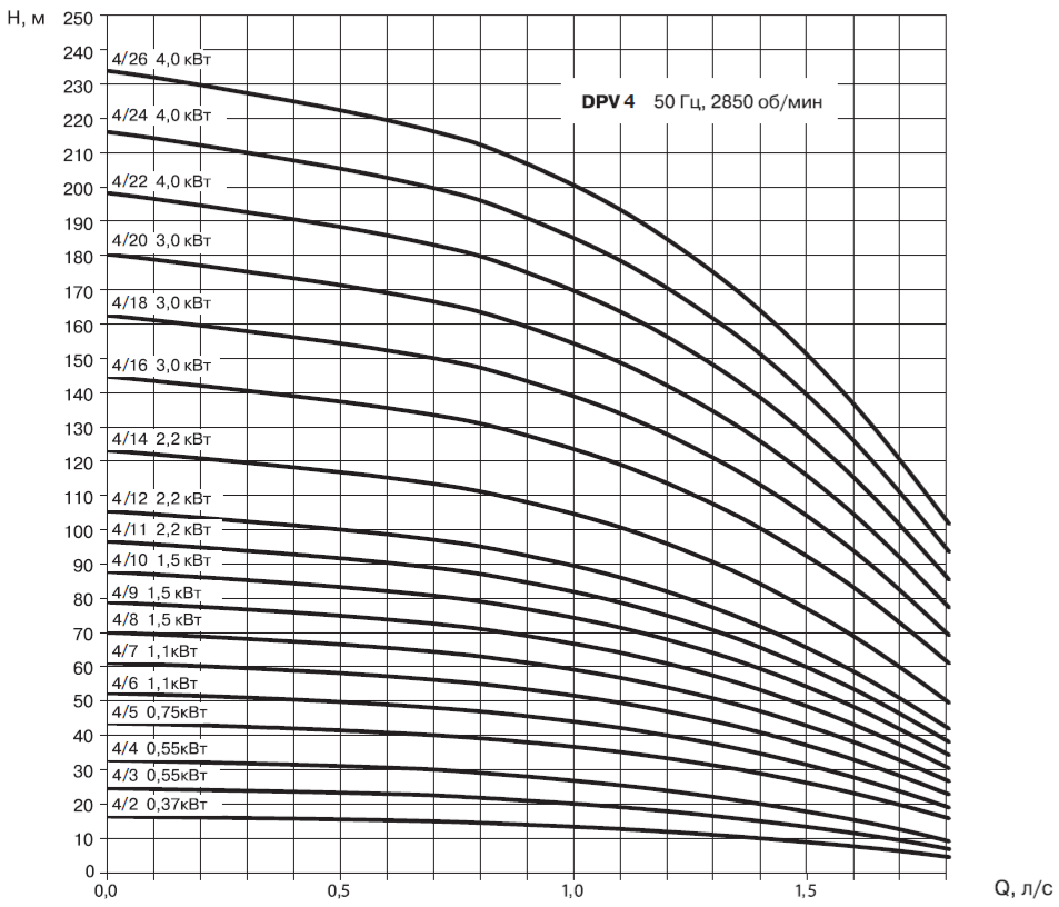 • Насосы должны использоваться в пределах рабочего интервала, указанного выделенной кривой на графике, чтобы исключить повышенный износ при высоких напорах и перегрев двигателя при больших подачах.