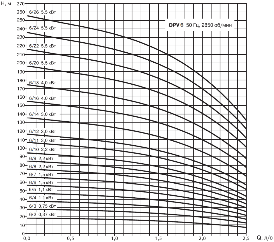 • Насосы должны использоваться в пределах рабочего интервала, указанного выделенной кривой на графике, чтобы исключить повышенный износ при высоких напорах и перегрев двигателя при больших подачах.