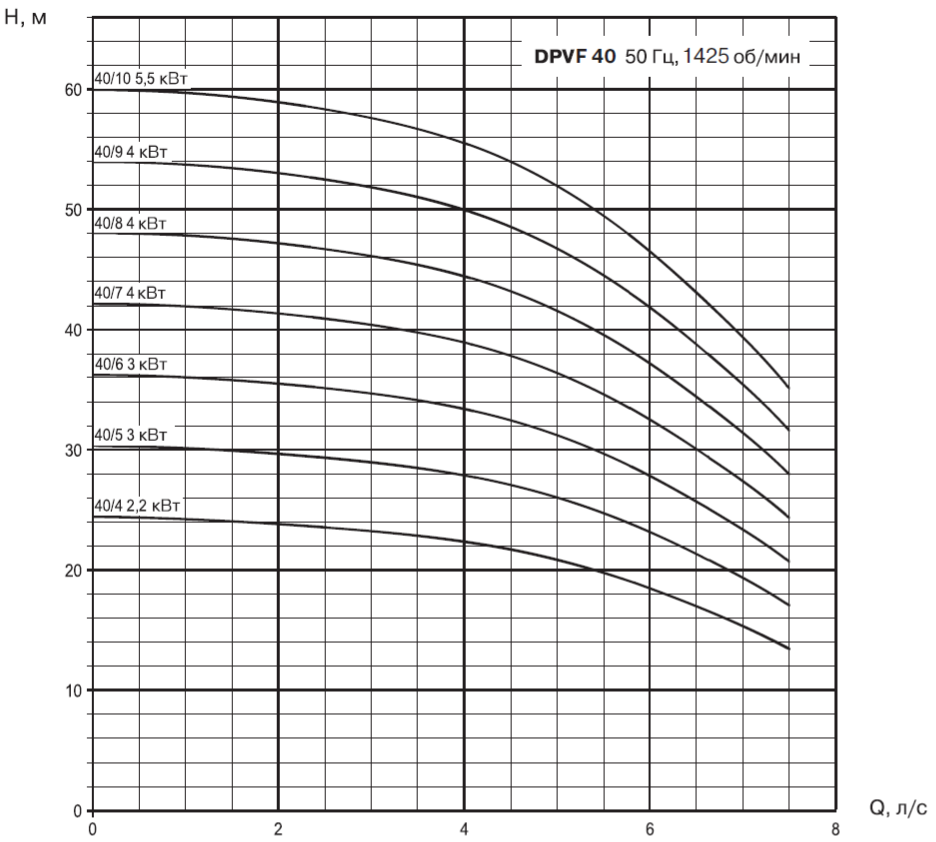 • Насосы должны использоваться в пределах рабочего интервала, указанного выделенной кривой на графике, чтобы исключить повышенный износ при высоких напорах и перегрев двигателя при больших подачах.