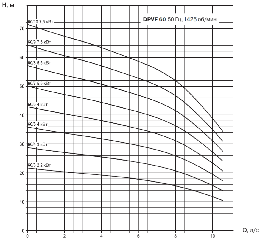 • Насосы должны использоваться в пределах рабочего интервала, указанного выделенной кривой на графике, чтобы исключить повышенный износ при высоких напорах и перегрев двигателя при больших подачах.