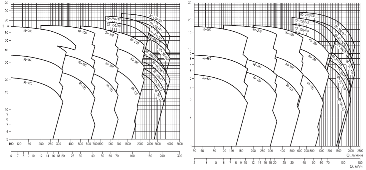 • Насосы должны использоваться в пределах рабочего интервала, указанного выделенной кривой на графике, чтобы исключить повышенный износ при высоких напорах и перегрев двигателя при больших подачах.
