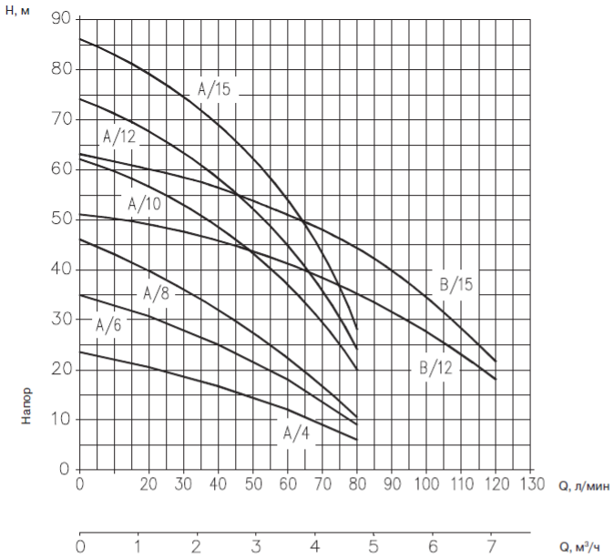 • Насосы должны использоваться в пределах рабочего интервала, указанного выделенной кривой на графике, чтобы исключить повышенный износ при высоких напорах и перегрев двигателя при больших подачах.