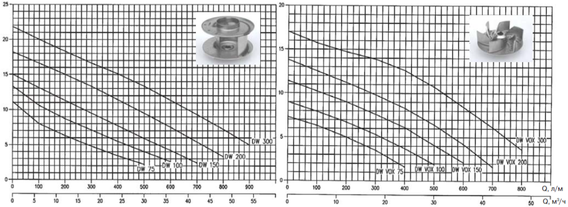 • Насосы должны использоваться в пределах рабочего интервала, указанного выделенной кривой на графике, чтобы исключить повышенный износ при высоких напорах и перегрев двигателя при больших подачах.