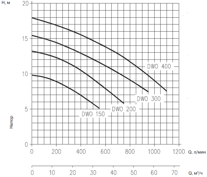 • Насосы должны использоваться в пределах рабочего интервала, указанного выделенной кривой на графике, чтобы исключить повышенный износ при высоких напорах и перегрев двигателя при больших подачах.