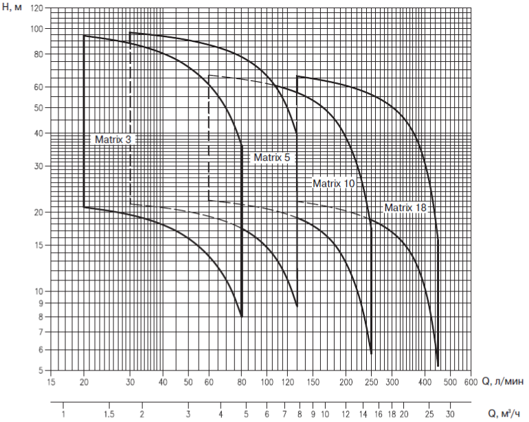 • Насосы должны использоваться в пределах рабочего интервала, указанного выделенной кривой на графике, чтобы исключить повышенный износ при высоких напорах и перегрев двигателя при больших подачах.