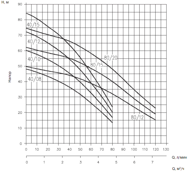 • Насосы должны использоваться в пределах рабочего интервала, указанного выделенной кривой на графике, чтобы исключить повышенный износ при высоких напорах и перегрев двигателя при больших подачах.