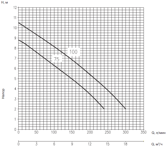 • Насосы должны использоваться в пределах рабочего интервала, указанного выделенной кривой на графике, чтобы исключить повышенный износ при высоких напорах и перегрев двигателя при больших подачах.