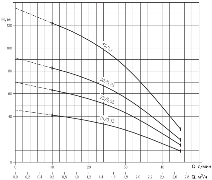 • Насосы должны использоваться в пределах рабочего интервала, указанного выделенной кривой на графике, чтобы исключить повышенный износ при высоких напорах и перегрев двигателя при больших подачах.