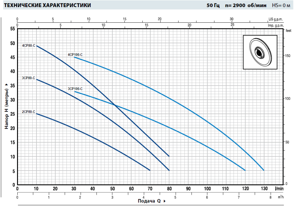 • Насосы должны использоваться в пределах рабочего интервала, указанного выделенной кривой на графике, чтобы исключить повышенный износ при высоких напорах и перегрев двигателя при больших подачах.