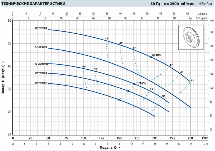 • Насосы должны использоваться в пределах рабочего интервала, указанного выделенной кривой на графике, чтобы исключить повышенный износ при высоких напорах и перегрев двигателя при больших подачах.