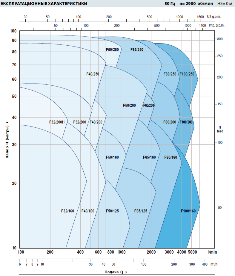 • Насосы должны использоваться в пределах рабочего интервала, указанного выделенной кривой на графике, чтобы исключить повышенный износ при высоких напорах и перегрев двигателя при больших подачах.