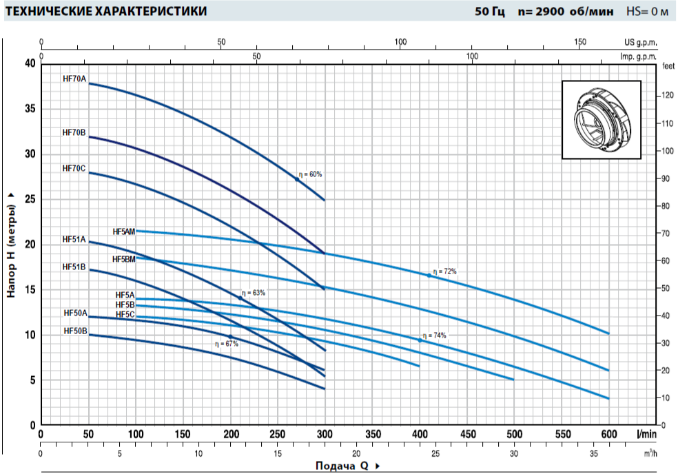 В серии HF имеются центробежные водяные насосы с 1 рабочим колесом. Изделия разработаны для достижения максимально высоких показателей подачи жидкости при низкой и средней величинах напора. Рабочее колесо, которое качается на ведущем валу, расположено перед всасывающим патрубком.