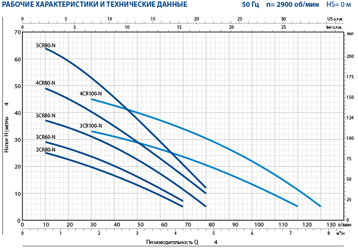 Серия 2-5CR включает в себя МНОГОСТУПЕНЧАТЫЕ ЭЛЕКТРОНАСОСЫ ЦЕНТРОБЕЖНОГО ТИПА с корпусом насоса из нержавею щей стали, горизонтальным валом и с переменным числом рабочих колес; установленых в корпусе из нержавеющей стали. Рабочие колеса, установленные на одном и том же ведущем валу, вращаются внутри лопаточных диффузоров, которые обеспечивают движение жидкости на выходе каждого рабочего колеса по направлению к всасывающему патрубку следующего рабочего колеса. После прохождения через все рабочие колеса, установленные последовательно, жидкость выталкивается из насоса через нагнетательный патрубок, предусмотренный в корпусе насоса. Каждое рабочее колесо с соответствующим лопаточным диффузором составляют ступень нагнетания, которая, согласно принципу функционирования центробежных насосов, сообщает жидкости перепад давления, который суммируется с равными перепадами давления, сообщаемыми другими