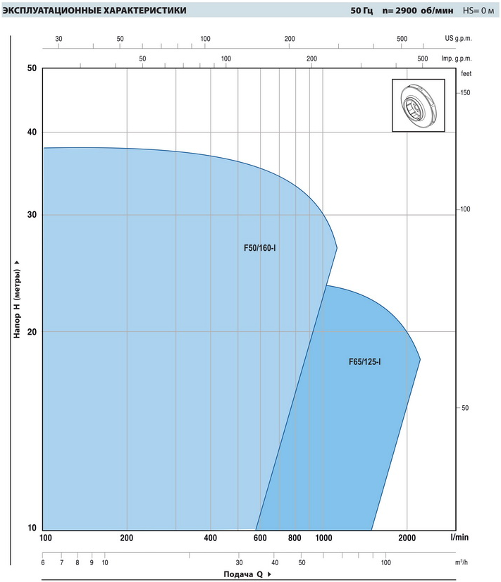 • Насосы должны использоваться в пределах рабочего интервала, указанного выделенной кривой на графике, чтобы исключить повышенный износ при высоких напорах и перегрев двигателя при больших подачах.