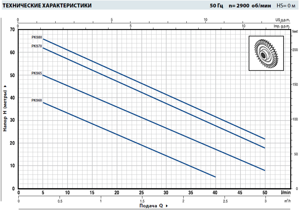 • Насосы должны использоваться в пределах рабочего интервала, указанного выделенной кривой на графике, чтобы исключить повышенный износ при высоких напорах и перегрев двигателя при больших подачах.