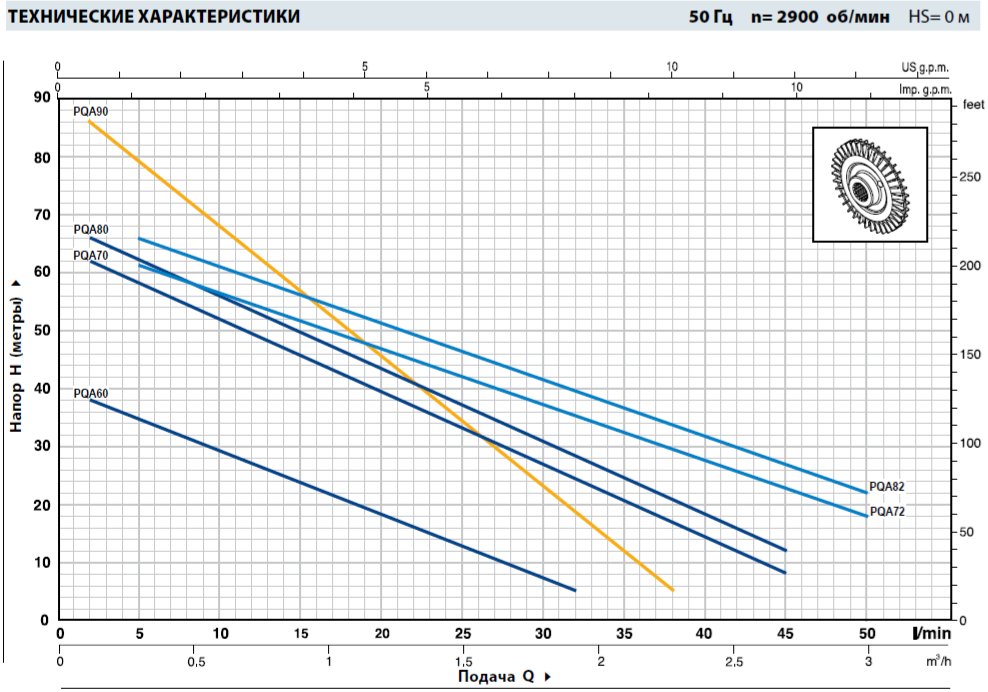 Серия PQA включает в себя вихревой электронасос, назначение которого связано с тем, что на периферии его рабочего колеса имеется большое количество радиальных лопаток, передающих энергию накачиваемой жидкости. Специальный профиль лопаток обеспечивает радиальную рециркуляцию поступающей в насос жидкости между лопатками рабочего колеса и двойным каналом, расположенным по его обеим сторонам. Так как каждая из многочисленных лопаток участвует в передаче энергии, давление жидкости постепенно возрастает в процессе ее перехода от всасывающего к нагнетательному патрубку; тем самым обеспечивается, с одной стороны, равномерность потока и отсутствие пульсаций, а с другой стороны - высокое давление и крутизна характеристик рабочих кривых. При относительно простой конструкции насос серии PQA отличает особо тщательно выполненная механическая обработка, позволяющая избежать ухудшения рабочих характеристик.
