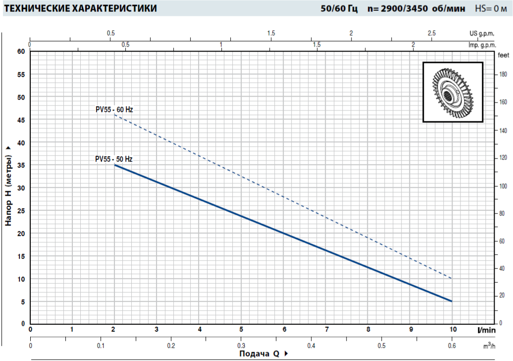 • Насосы должны использоваться в пределах рабочего интервала, указанного выделенной кривой на графике, чтобы исключить повышенный износ при высоких напорах и перегрев двигателя при больших подачах.