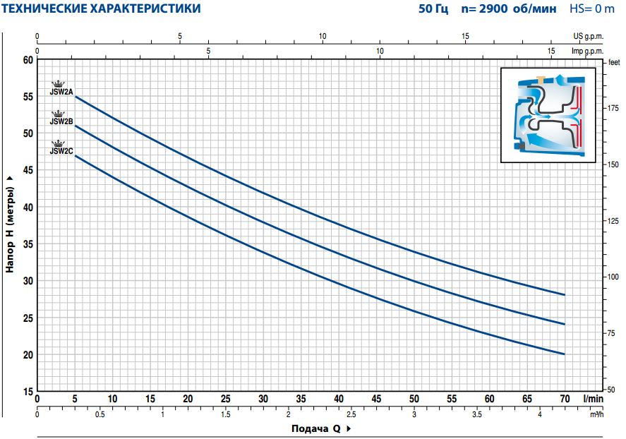 Серия JSW включает в себя САМОВСАСЫВАЮЩИЕ ЭЛЕКТРОНАСОСЫ ЦЕНТРОБЕЖНОГО ТИПА. Эффект самовсасывания достигается благодаря эжектору, установленному в корпусе насоса. Только часть общей подачи жидкости, выработанной рабочим колесом закрытого центробежного типа, направляется в нагнетательный патрубок; оставшаяся часть рециркулируется посредством эжектора, который, будучи соединен с камерой всасывания, создает в ней разрежение, необходимое для самовсасывания. При первом запуске достаточно заполнить водой корпус насоса. Заполнять всасывающий трубопровод и удалять возможно присутствующие воздушные пробки нет необходимости. В момент запуска вода, содержащаяся в корпусе, циркулируя через эжектор, переместит воздух из камеры всасывания в нагнетательную камеру, выталкивая его через выходной трубопровод. Образовавшийся таким образом вакуум приведет к подъему уровня воды во всасывающем трубопроводе, вызывая явление самовсасывания.