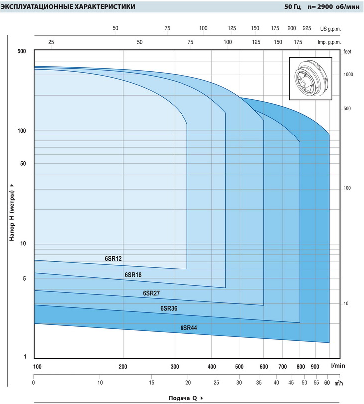 • Насосы должны использоваться в пределах рабочего интервала, указанного выделенной кривой на графике, чтобы исключить повышенный износ при высоких напорах и перегрев двигателя при больших подачах.