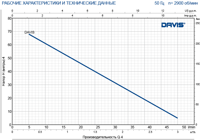 • Насосы должны использоваться в пределах рабочего интервала, указанного выделенной кривой на графике, чтобы исключить повышенный износ при высоких напорах и перегрев двигателя при больших подачах.